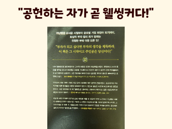 나는 부자들의 사고방식, 습관, 돈에 대한 태도, 돈을 버는 법칙 등등 내 인생의 지축을 흔들어 놓았던 부자들의 생각의 뿔리를 몸으로 체득했다. 그 과정에서 생생하게 배운 내용을, 간절히 성공을 꿈꾸는 분들에게 전해드리고 싶었다. 성공하고 싶거나 부자가 되고 싶은 사람들에게 이 책이 큰 도움이 될 것이라 자부한다. 진심으로 성공을 바라는 이들에게 한 줄기 목마름의 갈증을 해결해주는 오아시스 같은 선물이 되었으면 좋겠다.